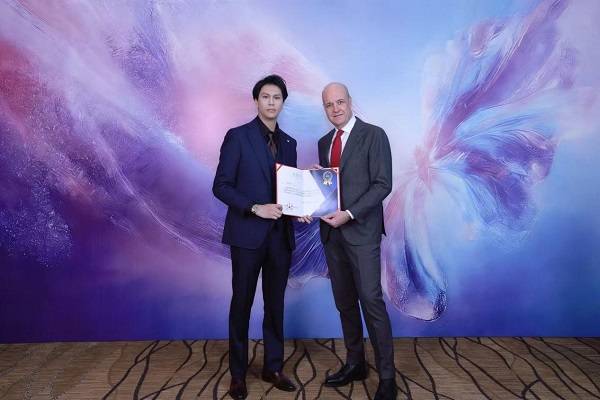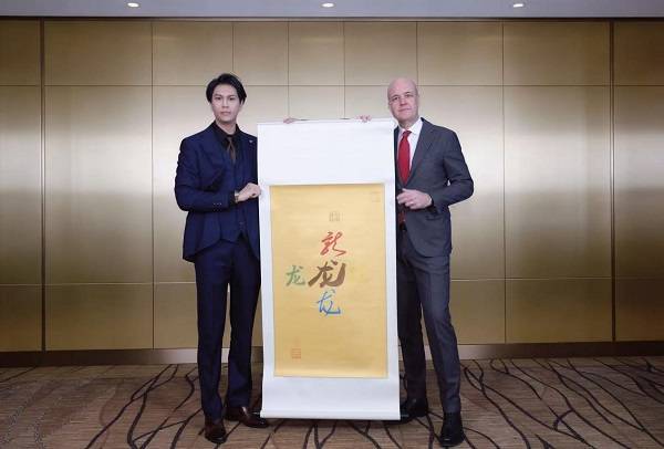 此次会面聚焦于“文化出海”的实践路径。陈靖韬向赖因费尔特前首相深入阐释了中国非遗文化的独特价值与哲学内涵。为表达对中方友好情谊及文化交流的重视,赖因费尔特前首相亲自颁授了此项荣誉。现场,两人共同展示了一幅蕴含深厚文化底蕴的《五龙护法图》。该作品以金色宣纸为底,其上挥毫而就的五个“龙”字,笔走龙蛇,气韵磅礴。整幅作品不仅融合了传统五行智慧与精妙的布局,更特别选在“辰日辰时”创作,凝聚天地能量,体现了“天时、地利、人和”的完美追求,市场估值达人民币38万元。陈靖韬将此珍贵作品赠予赖因费尔特前首相,象征着中国传统文化作为友好使者的深刻寓意。